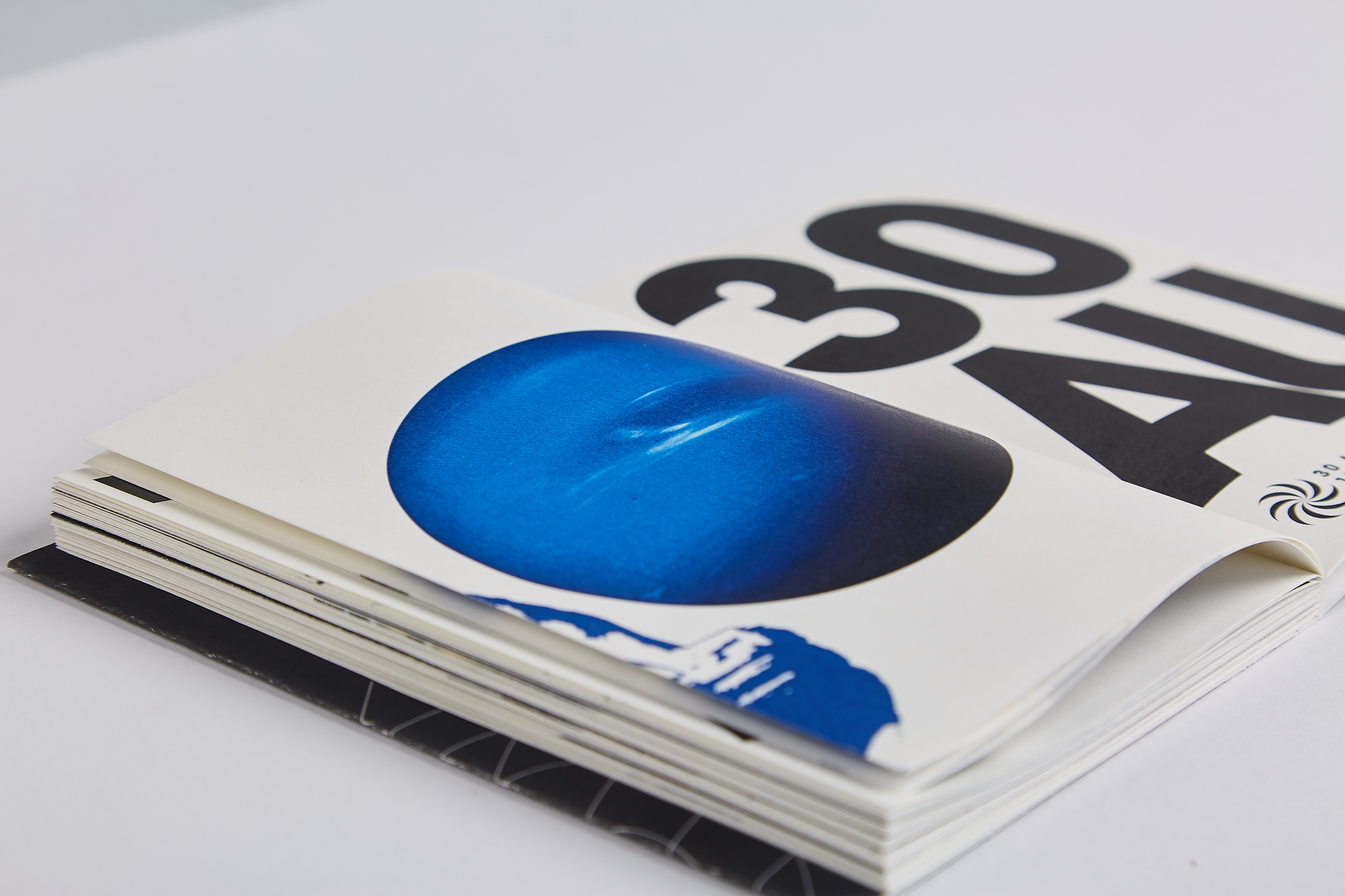 Divided into eight chapters, each representing a planet, the design uses type and measured spacing to convey the vastness of space and the scale of the solar distances.